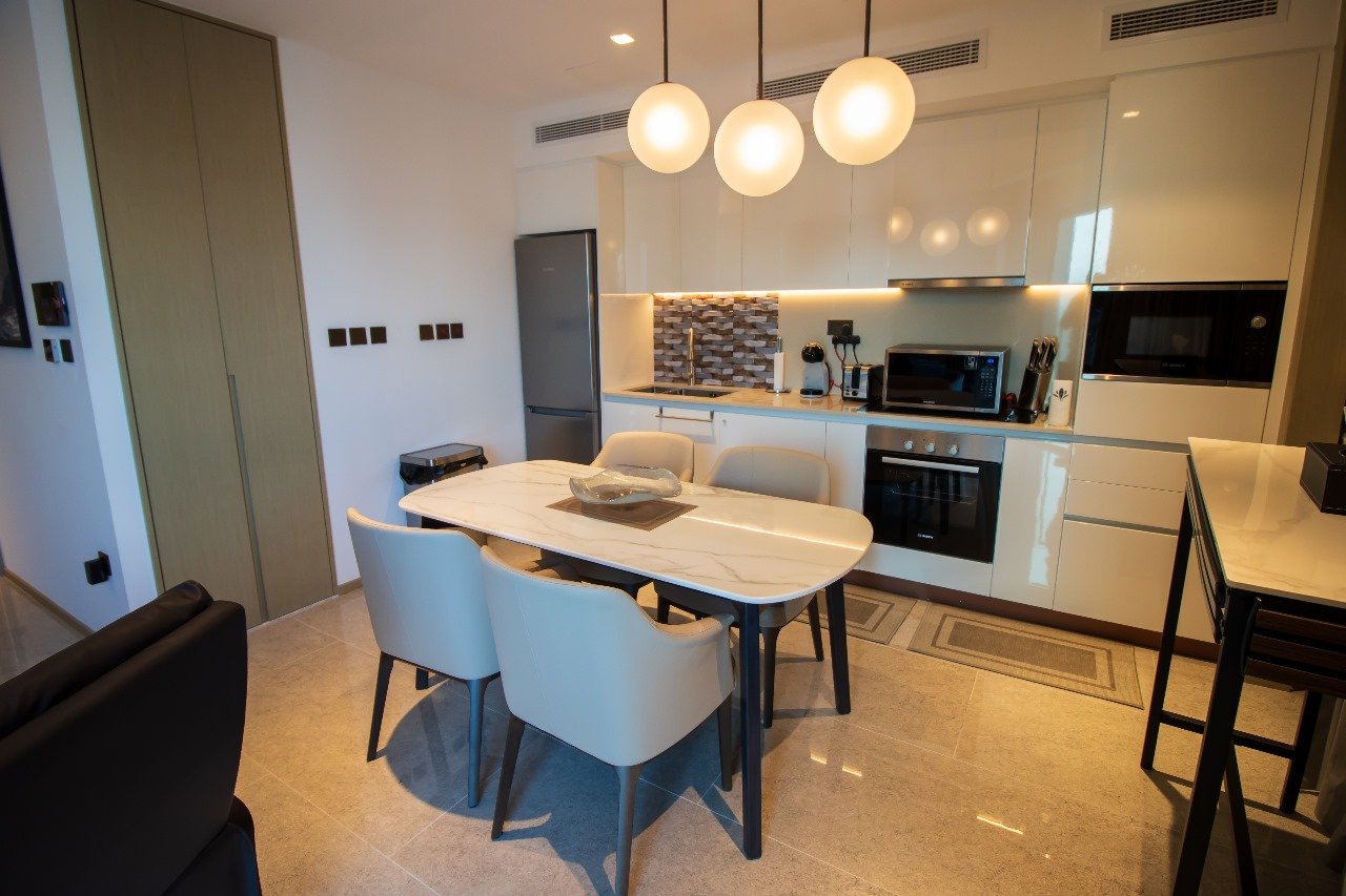Dual Master Suites: Two spacious bedrooms featuring king-sized plush bedding, walk-in wardrobes, and spa-like en-suite bathrooms finished in Italian marble and premium fixtures.