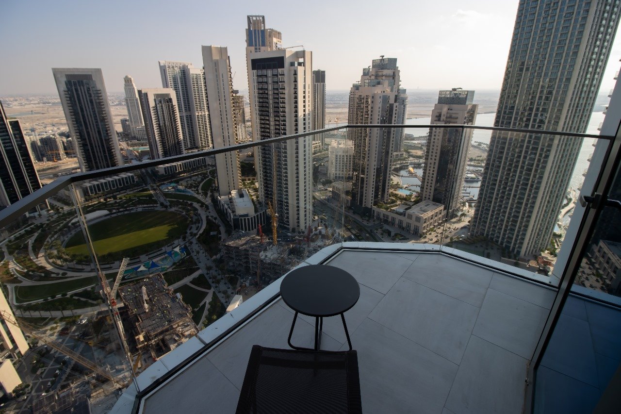Expansive Living Area: Featuring floor-to-ceiling windows that act as a live frame for the Dubai skyline and the iconic Creek Tower.